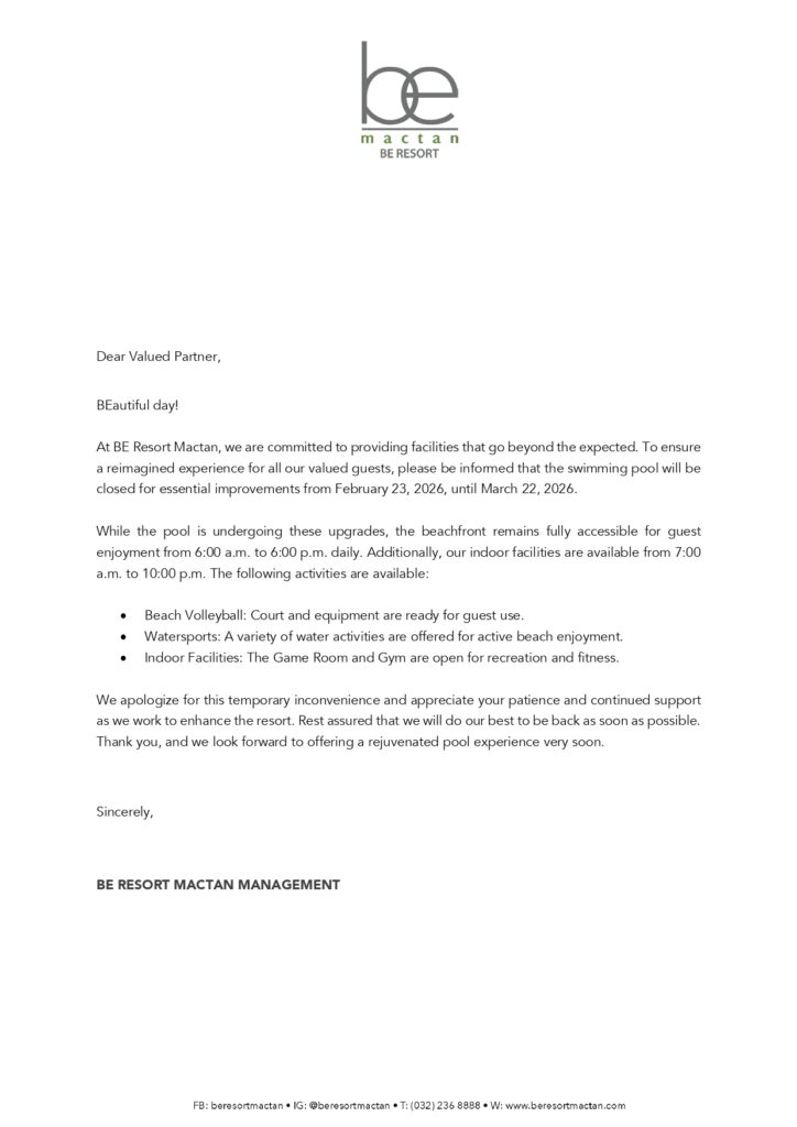 BE Resort Mactanでは、施設向上のための必須工事に伴い、スイミングプールを一時閉鎖いたします。